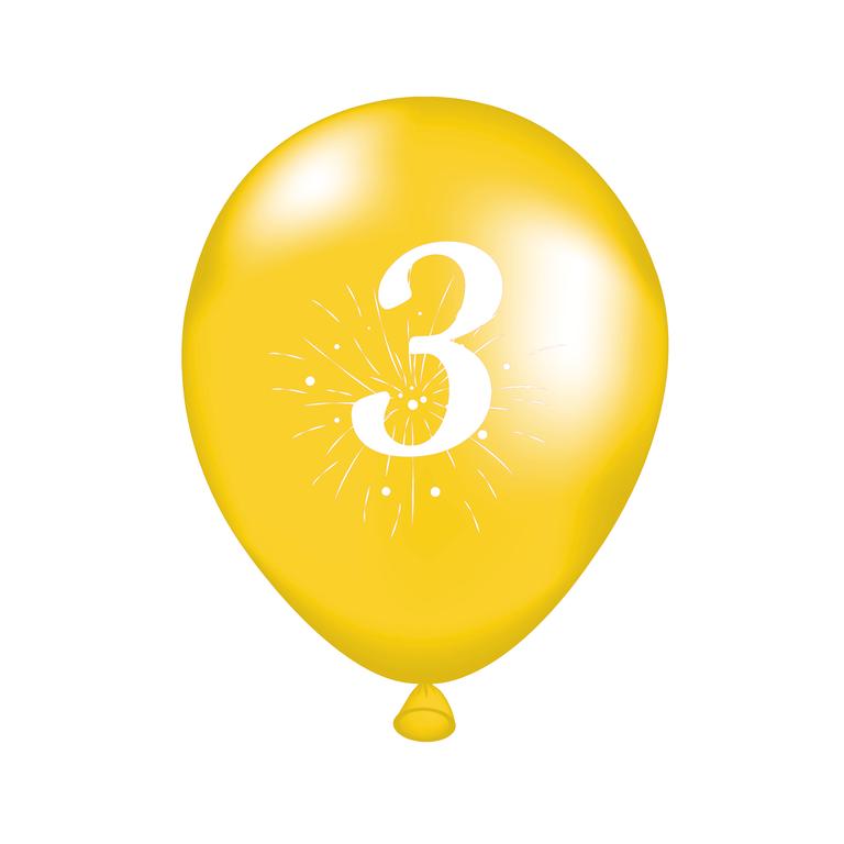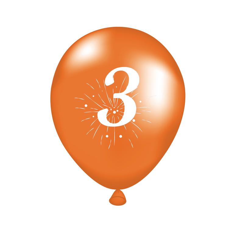 Party balónky s potiskem číslice "3" jsou vhodné na oslavu narozenin či různých výročí. Balení obsahuje 5 ks balónků (2x oranžový, 2x zelený, 1x žlutý o rozměru cca 25 cm (po nafouknutí). Balónky nafukujte pouze do přiměřeného rozměru. Manipulace dětí s balónky by měla probíhat pouze pod dozorem dospělé osoby. Skladujte při teplotách nad 10°C. Vyrobeno z přírodního latexu.
