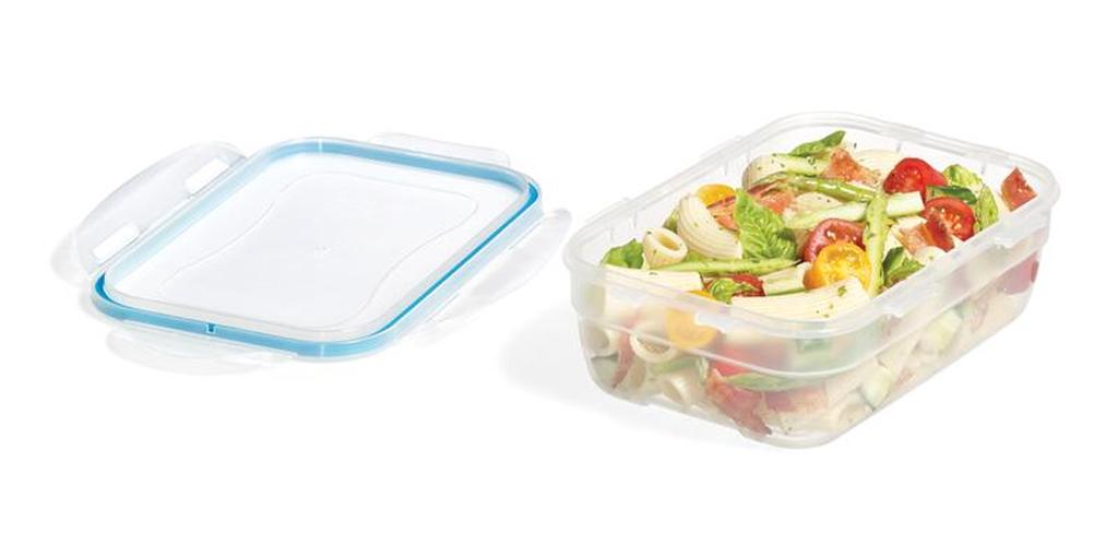 Dózy Lock & Lock "Easy Match" obdélníkové jsou bezpečné a funkční nádoby vyrobené z kvalitního plastu, který je trvanlivý a odolává vysokým teplotám. Tyto dózy jsou 100% vzduchotěsné a tím zajišťují dlouhodobou čerstvost uchovávaných potravin a jsou vynikající také z hlediska uchování vůně (aroma). Čtyři pohyblivé "klipy" zajišťující víko jsou odolné proti opotřebení. Nádoby mají speciálně upravené vnější dno tak, aby se mohly bezpečně stavět na sebe a neklouzaly. Dózy Lock & Lock lze použít v chladničce, v mikrovlnce, v mrazáku i v myčce na nádobí. Dózy Lock & Lock prošly přísnými hygienickými zkouškami a odpovídají nejpřísnějším předpisům. Objem 1,2 l. Barva čirá, tyrkysová.
