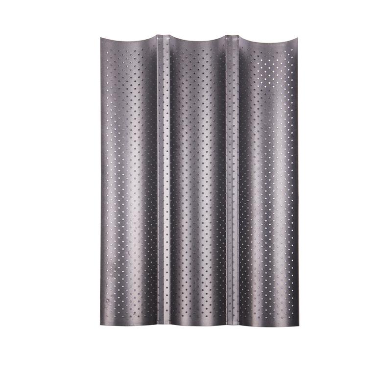 Forma na jednoduché upečení 3 baget má rozměr 38 x 24,5 cm. Hlavní výhodou této formy je to, že si bagety udrží svůj tvar. Povrch je nepřilnavý, není třeba ho ničím potírat. Další nespornou výhodou je to, že plech je perforovaný a bagety jsou po celém povrchu dobře a stejnoměrně upečeny a jsou krásně křupavé. Nedoporučujeme mytí v myčce nádobí, ale vzhledem k použitému materiálu je i mytí v ruce velmi snadné. Materiál - uhlíková ocel.