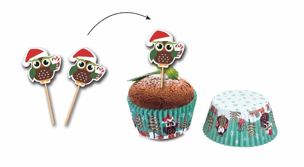 Formičky na muffiny - 24 ks + napichovátka 24 ks. Vhodné pro pečení muffinů, s oblíbeným motivem Sovy vánoce. Materiál - papír, dřevo.