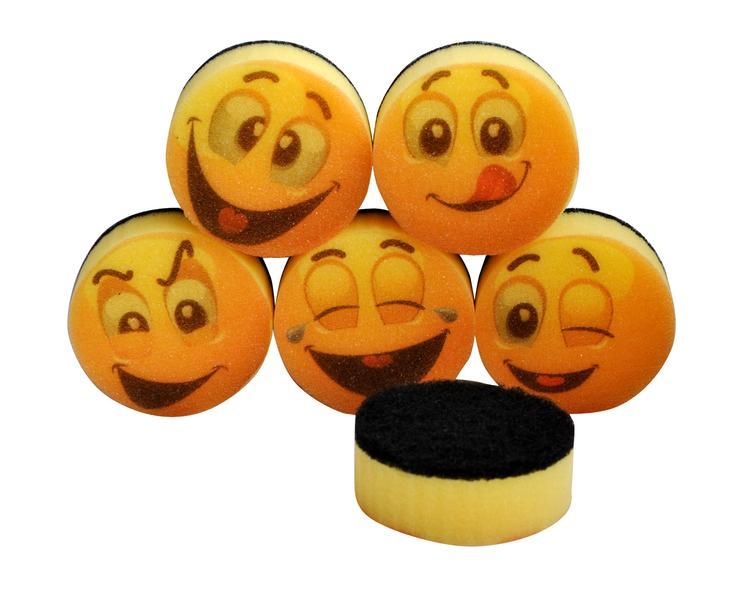 Houbička na nádobí má velmi účinou pevnou brusnou vrstvu odolnou proti opotřebení. Kulatá - veselý potisk smajlíků. Balení obsahuje 6 ks ve žluto-černé barvě. Rozměry - 7,9 x 3 cm.