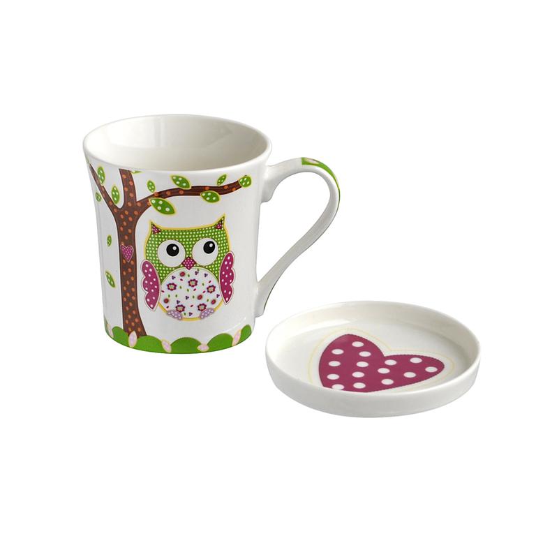 Hrnek o objemu 270 ml s krásným oblíbeným motivem "sova". Vhodný na čaj, s odkládacím táckem na čajové sáčky. Materiál - porcelán.