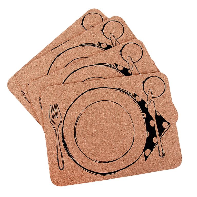 Sada korkového prostírání s motivem stolování. Prostírání je vyrobené z koreku o rozměrech 40 x 30 x 0,3 cm, 4 ks najde široké využití v každé domácnosti.