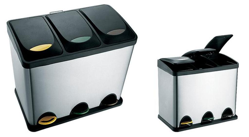Moderní odpadkový koš se třemi vyjímatelnými nádobami, z nichž každá má objem 8 litrů. Každá nádoba je vybavena samostatným madlem a lze do ní vkládat sáčky na smetí. Tento pomocník Vám pomůže efektivně třídit domovní odpad. Má nášlapný systém pro snadné otvírání a jednotlivé pedály jsou barevně odlišeny dle norem EU. Vnější plášť je z broušeného nerezu a víko z tvrzeného černého plastu. Snadná údržba, lehce omyvatelný. Celkové rozměry koše: šířka 46,5 cm, výška 41 cm (s otevřeným víkem 62,7 cm), hloubka 31 cm. Jednotlivé nádoby mají vnější rozměry 14x34x23 cm a vnitřní rozměry 12,5x34x21 cm.