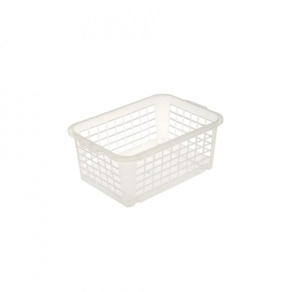 Plastový košíček je univerzální pomocník v domácnosti. Velmi pěkný designový a lehký košík je možné využít pro úschovu věcí v domácnostech nebo přenášení a odložení věcí dle rozměru výrobku. Košíček je velmi lehce omyvatelný od nečistot. Rozměry 25 x 17 x 10 cm. Barva transparentní.