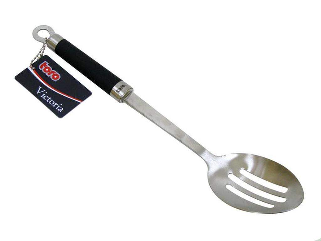 Servírovací lžíce na salát s drážkami je klasikou mezi kuchyňským náčiním, která se používá na přípravu salátu. Tento výrobek je snadno omyvatelný a vhodný do myčky na nádobí. Rukojeť je uzpůsobena pro zavěšení na závěsnou tyč. Řada Victoria. Materiál - nerez, pogumovaný plast. Rozměry - 34, 3 x 6, 5 cm.