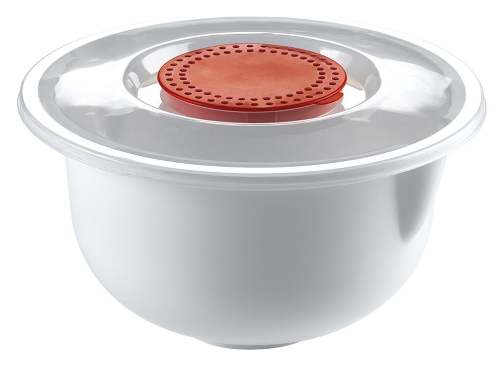 Šlehací mísa s krytem ochrání Vaši kuchyň před znečištěním při přípravě různých krémů, těst atd. Tato mísa Vám ulehčí práci při vaření. Unikátně řešené víko, které můžete otevřít dvěma způsoby - celé víko nebo pouze jeho červenou vnitřní část, kterou pak můžete použít na dno mísy, aby Vám při šlehání neklouzala. Průměr 24 cm, výška 13,5 cm.