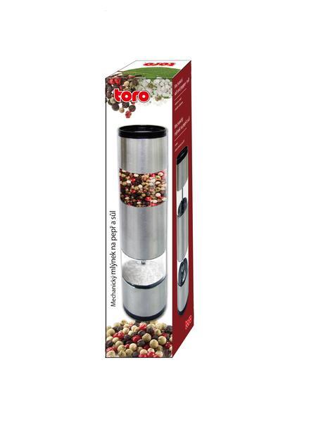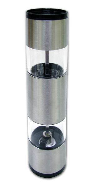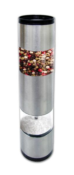 Mechanický ruční mlýnek na pepř a sůl. Oboustranné použití - na každé straně mlýnku lze mít odlišné koření či sůl. Moderní design mlýnku vhodný jako dekorace na stole i jako dárek. Materiál - nerez, plast. Rozměry - 5,2 x 22 cm.