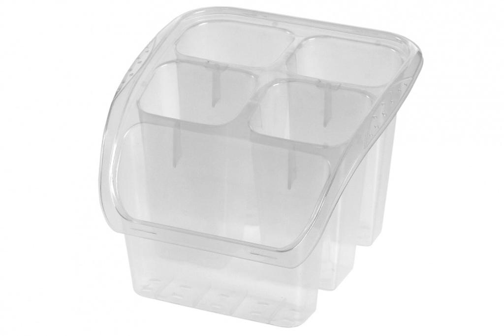 Odkapávač na příbory z plastu má 4 menší sekce o rozměrech 4,5 x 6,2 x 11 cm a 1 větší sekci o rozměrech 11,5 x 3,5 x 9 cm. Dodáváno bez podnosu. Rozměry příborníku - 15 x 16 x 11,5 cm. Barva - transparentní.