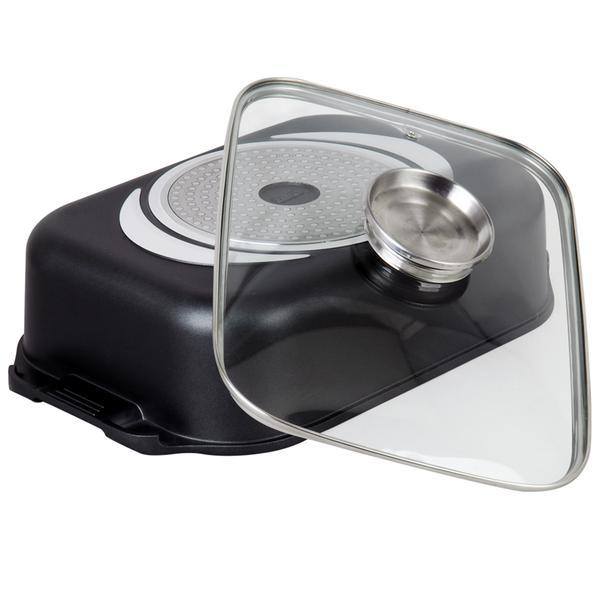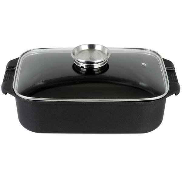 Pekáč se skleněnou poklicí patří mezi klasické pomocníky v domácnosti. Pekáč je hliníkový s nepřilnavým povrchem a se skleněnou poklicí. Poklice má masivní nerezový úchyt a otvor na odcházení přebytečné páry. Je vhodný na přípravu masa, zeleniny a dalších pokrmů. Vnější rozměry pekáče: 34,5x24,5x10cm. Vhodný na indukci i do trouby (max. 240 °C). Barva černá.