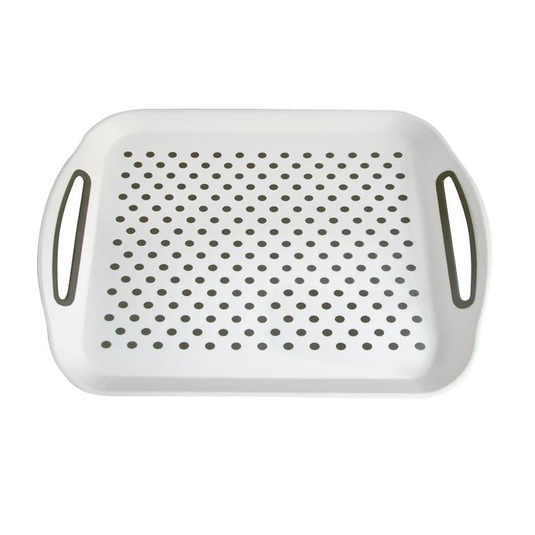Podnos se speciální protiskluzovou úpravou. Praktický a pevný plastový tác bude skvělým pomocníkem při servírování různých pokrmů. Servírovací plastový tác je vyroben z plastu s protiskluzovou úpravou uvnitř i na dně tácu. Rozměry - 41 x 29 cm. Barva bílá s puntíky.