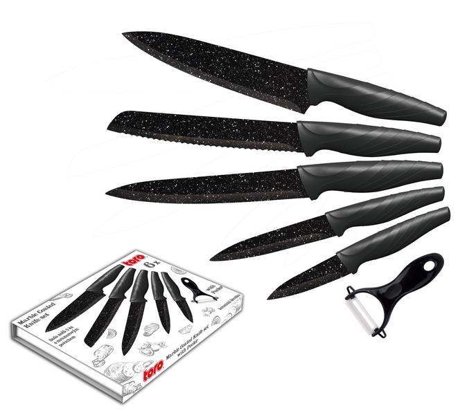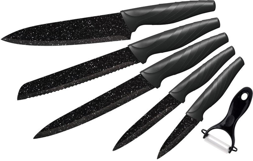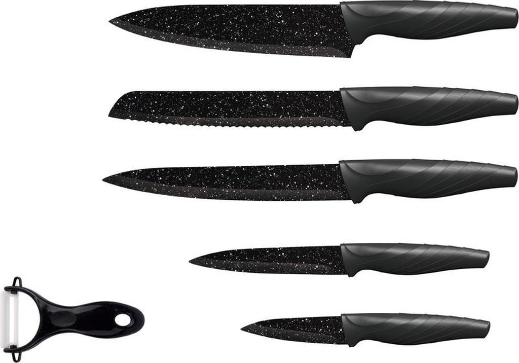 Kvalitní sada 5 nožů s mramorovým povrchem. Kuchyňské nože mají ergonomickou rukojeť, ostrou nerezovou čepel a hladký povrch. Jsou vysoce odolné a snadno se čistí. Sada obsahuje: kuchařský nůž 32,5 cm (délka čepele: 20 cm), porcovácí nůž 32,5 cm (délka čepele: 20 cm), nůž na chléb 32,5 cm (délka čepele: 20 cm), univerzální nůž 23 cm (délka čepele 12,5 cm), loupací nůž 19 cm (délka čepele: 8,75 cm) + keramická škrabka 13 cm.