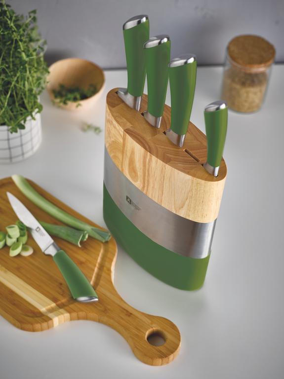 Sada 5 nožů v bloku RICHARDSON SHEFFIELD Fusion se zelenou rukojetí je speciálně navržena pro každodenní použití. Designové nože se stojanem od značky Amefa se hodí do každé moderní kuchyně. Nože jsou vyrobeny z vysoce kvalitní nerezové oceli, čepel každého nože je extrémně ostrá. Díky své lehké váze a perfektnímu ergonomickému tvaru nabízí tyto nože maximální komfort při krájení. Nože jsou vhodné do myčky. Blok do myčky nepatří. Neponořujte blok na nože ani do vody. Pokud je znečištěný, jednoduše jej pouze otřete vlhkým hadříkem.