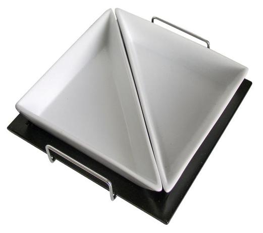 Velmi oblíbená sada dvou keramických trojúhelníkových misek na dřevěném podnose je velmi praktická při servírování různých pokrmů. Nerezová ouška zajišťují lehkou manipulaci. Misky jsou vhodné do myčky na nádobí, podnos je snadno omyvatelný, stačí přetřít vlhkým hadříkem. Objem každé misky je 200 ml. Rozměry podnosu -19, 4 x 19, 1 cm.