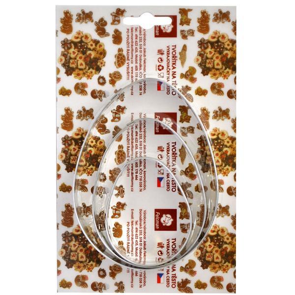 Velikonoční vykrajovátka na cukroví ve tvaru vajíček. Vykrajovátka jsou vyrobená z pocínovaného plechu. Vykrajovátka jsou od českého výrobce a splňují všechny předepsané normy. Balení 3 ks různých velikostí vajíček: 12 x 8,5 cm, 9 x 7 cm a 7 x 5,3 cm.