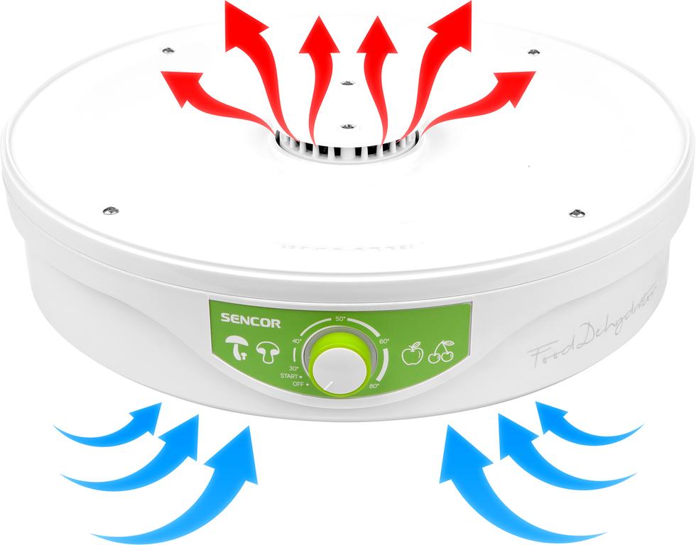 Sušička potravin Sencor má ve výbavě 5 sušících sít a je vhodná například k sušení ovoce, bylinek, hub, masa nebo ryb. Integrovaný ventilátor napomáhá rovnoměrnému sušení na všech patrech a design mřížky sušících sít zabraňuje vzniku plísní a optimalizuje proudění vzduchu.
