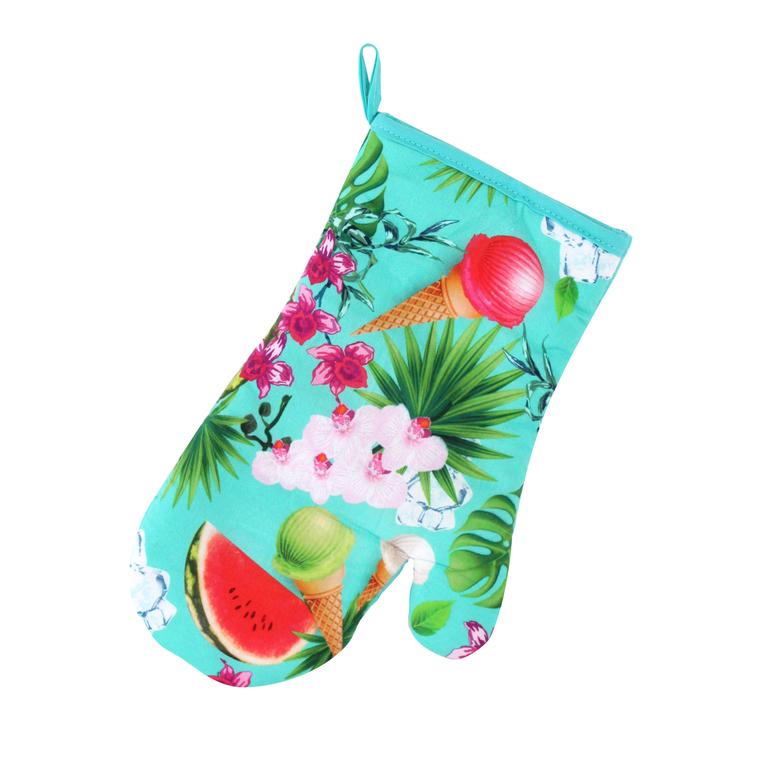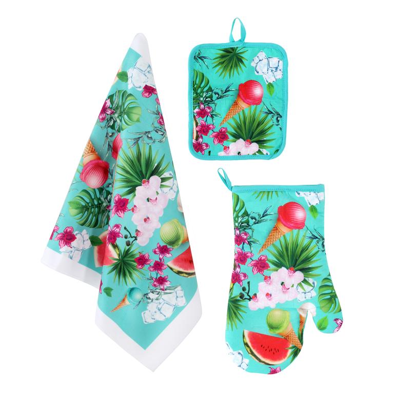 Kuchyňský set "LETNÍ MIX" obsahujíce rukavici, chňapku a utěrku. Všechny tyto pomůcky Vám budou nejen praktickým pomocníkem ale i vhodným módním doplňkem Vaší kuchyně. Všechny části setu mají praktické poutko pro zavěšení. Materiál - povrch - 100% bavlna, výplň chňapky a rukavice - 65% bavlna, 35% polyester.