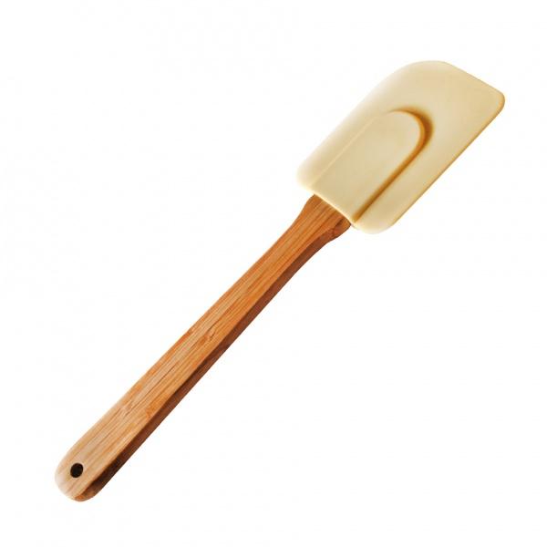 Silikonová stěrka je nedílnou součástí každé kuchyně. Je velkým pomocníkem při pečení a přípravě různých pokrmů. Díky silikonu je velmi šetrná ke kuchyňskému nádobí. Lehce omyvatelná. Materiál - silikon, bambus. Barva krémová. Rozměry - 5,8 x 25,5 cm.