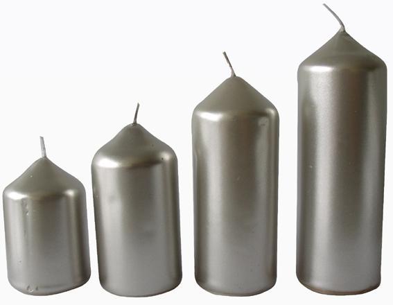 Nezapomeňte prosím dbát na bezpečnost a držte se na svíčce uvedených bezpečnostních piktogramů. Materiál parafín. Balení 4 ks. Průměr svíček je 4 cm. Výška jednotlivých svíček je: 6,5 , 8,5 , 10 a 12 cm. Barva - stříbrná.