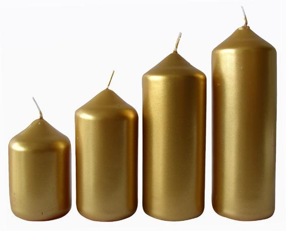 Nezapomeňte prosím dbát na bezpečnost a držte se na svíčce uvedených bezpečnostních piktogramů. Materiál parafín. Balení 4 ks. Průměr svíček je 4 cm. Výška jednotlivých svíček je: 6,5 , 8,5 , 10 a 12 cm. Barva - zlatá.