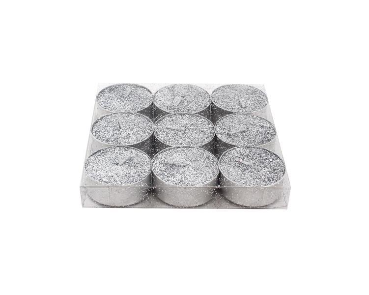 Barva stříbrná, třpytivý design. Sada 9 ks. Doba hoření: cca 4 hodiny.