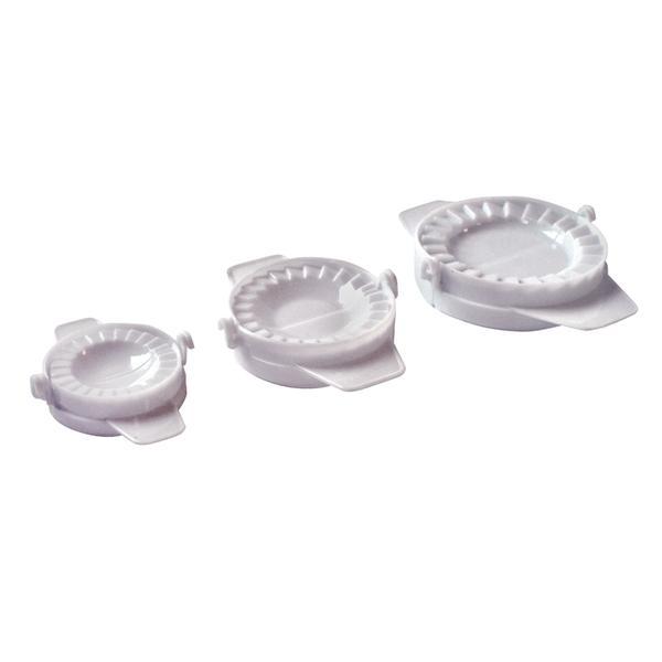 Pomůcka na tvoření taštiček. Vynikající pro přípravu sladkých i slaných, pečených i vařených taštiček a plněných těstovin. Set 3 ks. Vyrobeno z odolného plastu. Průměr 10 cm, 8 cm, 5,5 cm.
