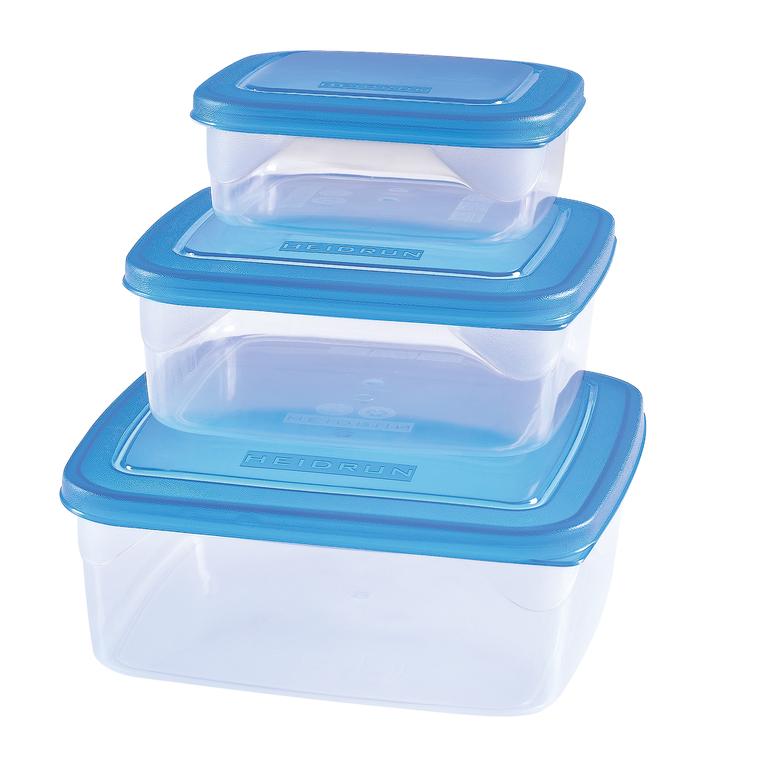 Sada 3 ks čtvercových plastových dóz, malá dóza: rozměr 13,5x13,5 cm, objem 0,6 l, střední dóza: rozměr 16,5x16,5 cm, objem 1 l, velká dóza: rozměr 19,5x19,5 cm , objem 1,8 l. Barva: zelená a modrá.
