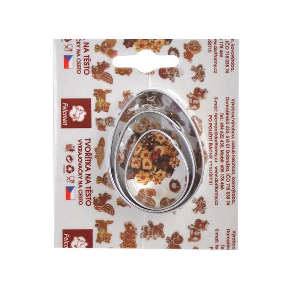Velikonoční vykrajovátka na cukroví ve tvaru vajíček. Vykrajovátka jsou vyrobená z nerezového plechu. Vykrajovátka jsou od českého výrobce a splňují všechny předepsané normy. Balení 3 ks různých velikostí vajíček.