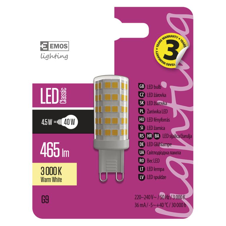 Žárovka LED CLS JC A++ 4,5W G9 WW - počet čipů: 71, účiník: 0,5, světelný tok/svítivost: 465 lm, typ čipů: 2835, teplota chromatičnosti: 3 000 K, rozměr: 19 × 54 mm, prodejní obal: 1 ks, krabička, kategorie/řada: CLASSIC, barva světla: teplá bílá, index podání barev (CRI): Ra >80, světelná účinnost: 103 lm/W, tvar: JC, technologie: LED, patice (uchycení žárovky): G9, příkon: 4,5 W, náhrada za žárovku: 40 W, životnost: 30 000 hodin, napětí: 230 V~/50 Hz, energetická třída: A++, startovací doba: 0,1 s, úhel vyzařování: 300°, počet spínacích cyklů: 25 000, záruční doba: 3 roky, stmívatelná: ne