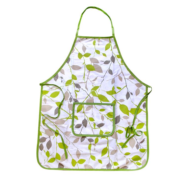 Kuchyňská zástěra s motivem zelených květů vyrobená ze 100% bavlny. Varianta obepínací zástěry s náprsenkou, vpředu opatřena kapsičkou. Možné praní na 30 st.C. Rozměr zástěry - 60 x 74 cm.